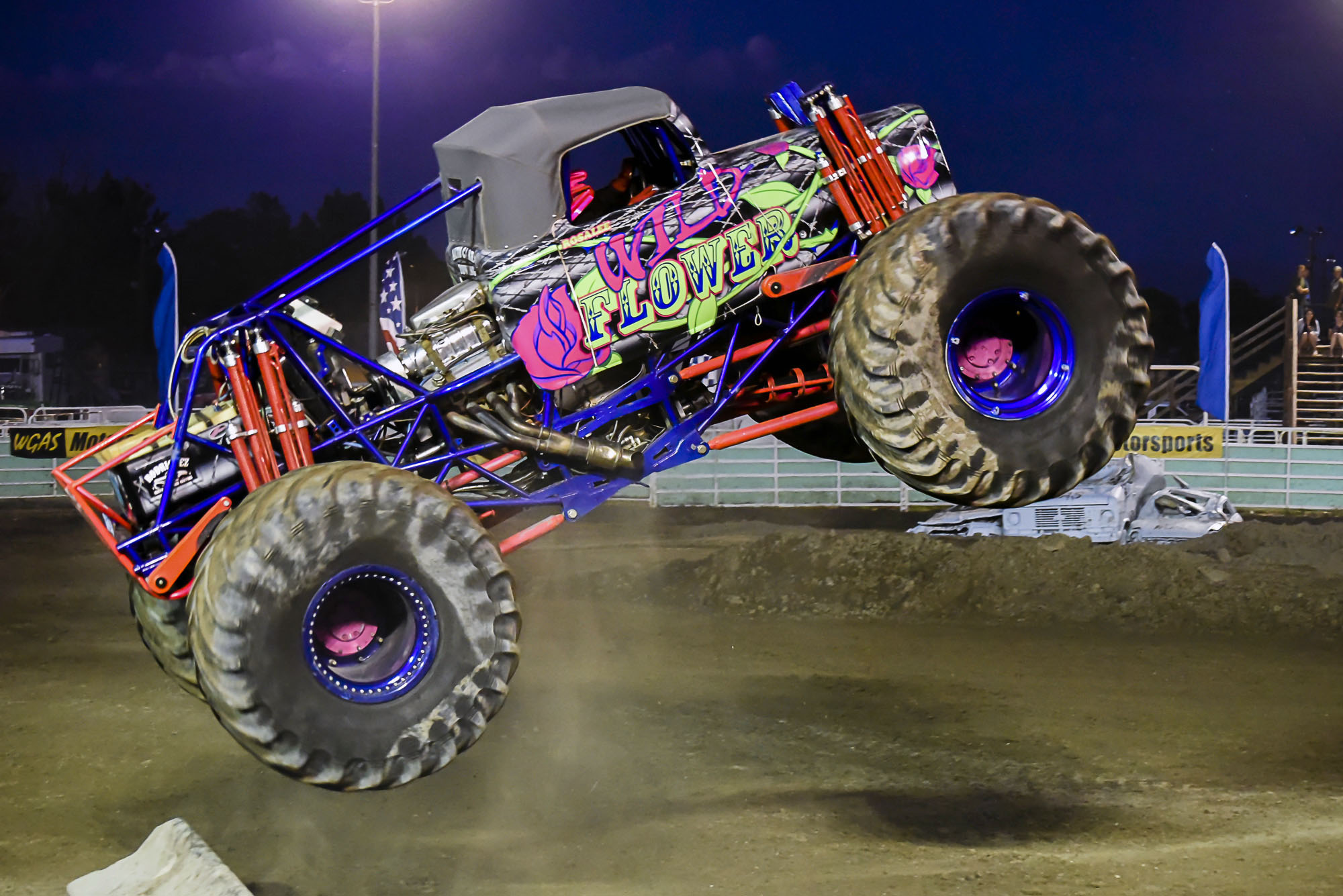 This GIF is the most obvious if you look carefully. The color cast rotates between violet and green. This comes from inexpensive fluorescent bleacher lighting and American AC electricity. Power to the light comes in alternative waves (a sine wave) and on one side of the wave you get green and the other side you get violet. With a high-speed shutter such that can capture this monster truck’s high-speed spin, you will also catch that sine wave because it takes 1/60th of a second to shift from one to the other. If I had shot at 1/60th shutter speed it would’ve been white but then the truck would be a blurry mess. And in JPEG, you can’t really fix the color as well (it was way worse than what you see here). Source.